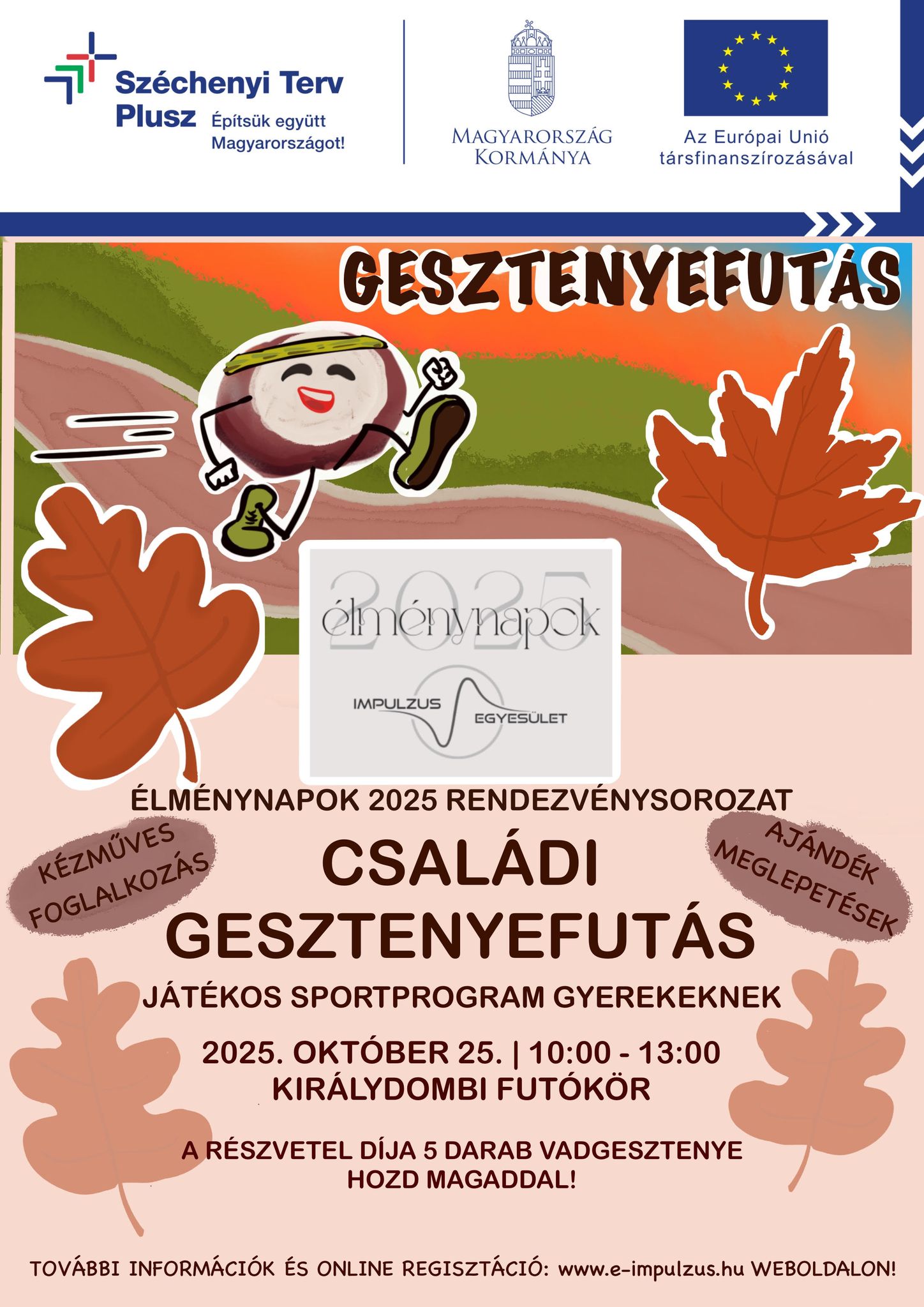 Idén az Európai Unió által finanszírozott Hagyományunk a jövőnk! pályázatban elnyert támogatásnak köszönhetően hirdette meg az Élménynapok 2025 elnevezésű rendezvénysorozatát a fóti Impulzus Szabadidő Sport és Kulturális Egyesület. A sorozat következő állomása a gesztenyefutás, amit október 25-én, szombaton tartanak a Királydombi futókörön.